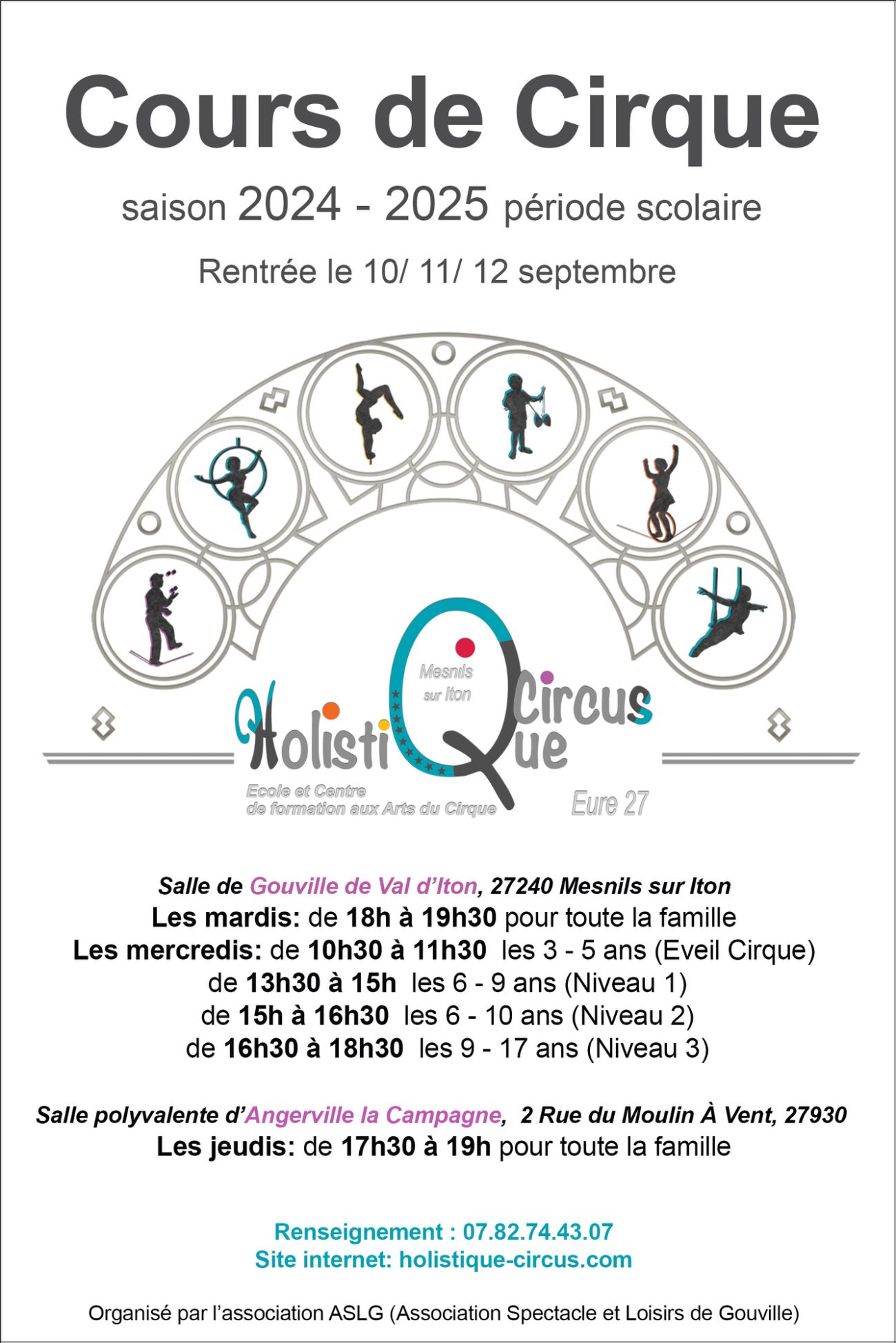 À quelques kilomètres d'Evreux, dans l'Eure, plus précisément à Mesnils-sur-Iton, Holistique Circus propose des cours, ateliers et stages autour des arts du cirque. Enfants, adultes, débutants ou confirmés, venez découvrir les disciplines du cirque et vous perfectionner ! Un encadrement professionnel, qualifié et expérimenté !